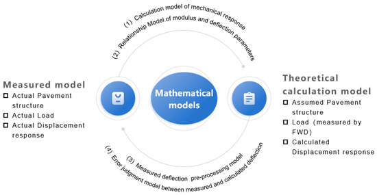 According to the general principles of modulus backcalculation [5], the model consists of three parts: the measured model, the theoretical calculation model, and the mathematical model, as shown in Figure 1.