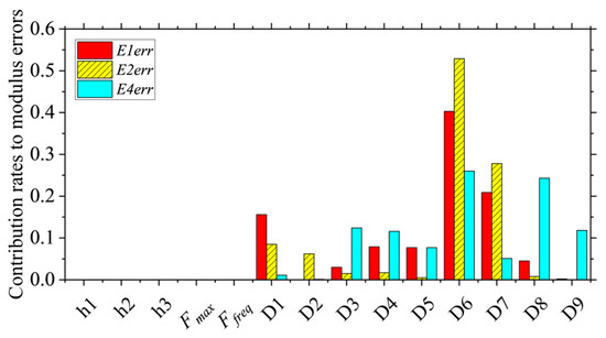 It can be found that the errors in thickness, load amplitude, and load frequency have almost no influence on the modulus error, while the contribution rate of deflection errors dominates overwhelmingly exceeding 99%. The deflection error has the greatest impact on the modulus error of the asphalt layer, followed by the subbase layer, base layer, and subgrade. And the modulus error of asphalt surface layer is significantly related to the deflection errors at D1, D4, D6, and D7, while the modulus error of base layer is more significantly related to the deflection errors at D1, D6, and D7. The modulus error of the subbase layer has a significant relationship with the deflection errors at D1 and D3 and the error in the subgrade modulus is significantly related to the deflection errors at D8 and D9. This can help engineers recognize the importance of correcting deflection errors and also assist them in quickly adjusting the modulus errors of various layers based on different deflection errors.