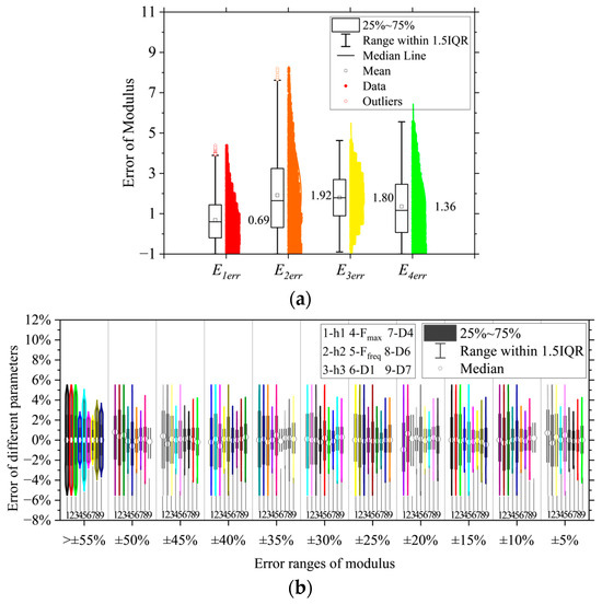 Allowing the error combinations of the nine parameters in Figure 5 to be randomly combined and substituted into the multiple linear regression Equation (6) or Equation (8), the theoretical errors of the modulus for each structural layer were calculated. The results are shown in Table 11 and Figure 6.