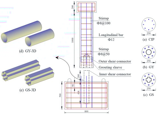 To investigate the seismic behavior of precast concrete bridge piers connected by hybrid joints, three different types of pier structures were designed at a scale ratio of 1:8. The specific configurations of the specimens are depicted in Figure 1. The pier has an effective height of 1100 mm and a pier body diameter of 250 mm. The loading end of the specimen measures 360 mm × 360 mm × 200 mm, while the ground beam measures 800 mm × 800 mm × 500 mm. The cast-in-place concrete pier (CIP specimen) features a pier shaft that is uniformly equipped with 8 longitudinal bars of HRB400 grade, each with a 12 mm diameter, arranged along the circumferential direction. Additionally, the stirrups are densely positioned in the plastic hinge area. The cross-sectional view of the CIP specimen is depicted in Figure 1a. The precast concrete bridge pier with a built-in circular steel tube connecting key (GY specimen) is equipped with 8 grouting sleeves arranged along the circumferential direction at the joint. The circular steel tube connecting key, with a diameter of 100 mm and a thickness of 8 mm, is positioned at the center of the joint. The connecting length of the steel tube connecting key is determined to be 200 mm in accordance with the specifications outlined in the GB 50936-2014 code []. The cross-sectional view of the GY specimen is depicted in Figure 1b. Furthermore, the precast concrete bridge pier with integrated cross-shaped steel tube connection keys (GS specimen) exhibits a similar cross-sectional configuration to the GY specimen, as shown in Figure 1c.