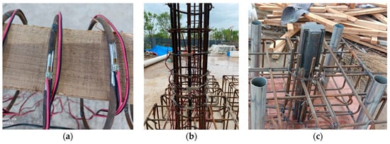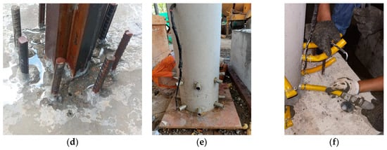 Manufacturing process of specimens. (a) Strain gauge sticking; (b) reinforcement cage; (c) shear connector; (d) surface cleaning; (e) pier shaft; (f) grouting.