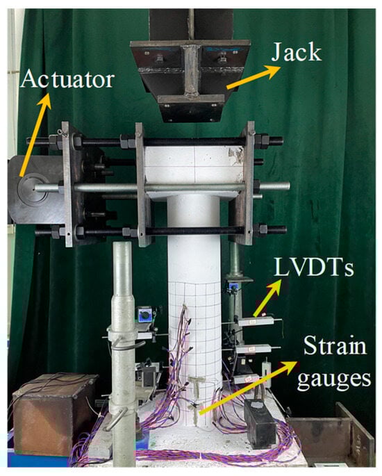 The specimen had an axial compression ratio of 0.2, and the test loading device is depicted in Figure 3. A vertical hydraulic jack with a vertical range of 100 tons was employed for the test loading. The horizontal actuator is a 100-ton MTS hydraulic servo actuator capable of exerting a maximum horizontal displacement of 250 mm. To prevent specimen slippage, the bearing platform was installed with two jacks in the horizontal direction. To monitor the displacement across the length of the specimen, three linear variable differential transformers (LVDTs) were placed on both the left and right sides of the pier, with vertical LVDTs set at a distance of 150 mm. Additionally, reinforcement and concrete strain gauges were installed in the plastic hinge region to monitor the strain distribution.