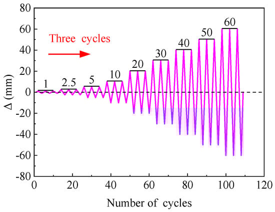 In accordance with GB50011–2010 [], displacement-controlled loading is employed for the specimen, with three cycles at each displacement level. The test is completed when the horizontal load-bearing capacity of the specimen is decreased to 85% of its maximum load-bearing capacity. The loading protocol is depicted in Figure 4.