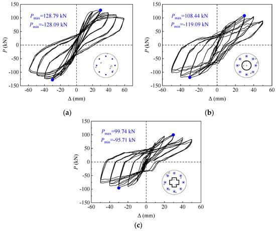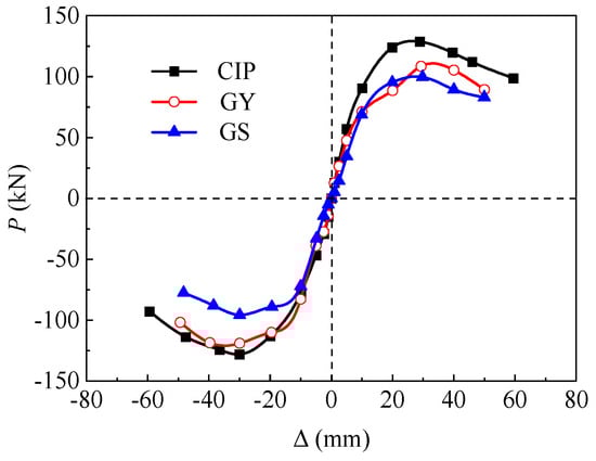 The horizontal load–displacement (P-Δ) hysteretic curves of the specimens are shown in Figure 7. These show that the load and displacement are positive when the load is positive, and they are negative when the load is negative.