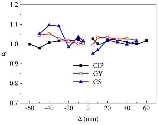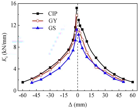 With the rising loading level, the specimen’s stiffness will decrease progressively due to the accumulation of damage. The secant stiffness (Ki) is employed to characterize the stiffness reduction of the pier []. The calculation formula is represented by Equation (4), and the outcomes of the calculations are depicted in Figure 12. Table 4 displays the stiffness eigenvalues of the specimens, including the average values of both positive and negative eigenvalues.