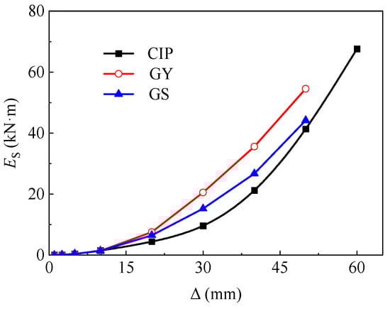 At the beginning of loading, ES values of the specimens are minimal and the curves exhibit substantial overlap, as depicted in Figure 11. As the horizontal displacement increases, ES values of the specimens also gradually increase. After the horizontal displacement exceeds 10 mm, ES of the GY specimen gradually surpasses that of the GS and CIP specimens. Ultimately, ES of the GY specimen increases by approximately 19.0% compared to that of the GS specimen. This indicates that by including the circular steel tube connection key at the joint, it is possible to enhance the bending capacity of the specimen and in turn improve the deformation and energy dissipation capacity of the precast concrete bridge pier. Furthermore, as the horizontal displacement reaches 50 mm, the loading of the precast concrete bridge pier stops due to the increased visibility of cracks and yielding of reinforcing bars above the sleeves, as well as a significant decrease in bearing capacity. Meanwhile, the ultimate ES of the CIP specimen exceeds that of the precast concrete bridge piers due to its superior overall performance.