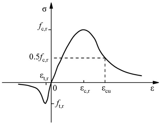 The concrete constitutive model utilizes the concrete constitutive relationship outlined in Appendix C of the GB 50010-2010 Code []. Figure 13 illustrates the uniaxial stress–strain curve. The equations representing the constitutive relationship for concrete compression are given as follows: