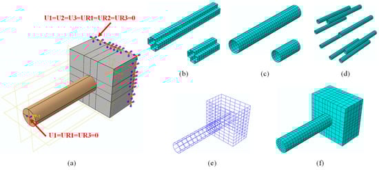 Schematic diagram of finite element model. (a) Boundary condition; (b) cross; (c) circular; (d) grouting sleeves; (e) reinforcement; (f) concrete mesh.