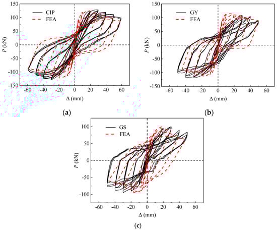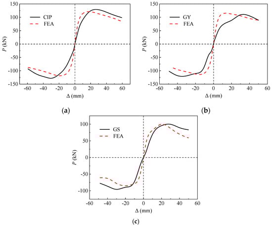 Hysteretic curves of specimens. (a) CIP specimen; (b) GY specimen; (c) GS specimen.