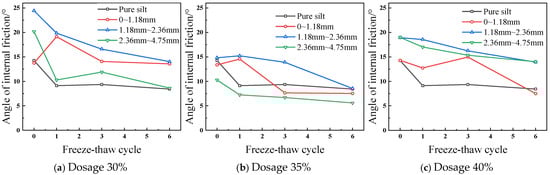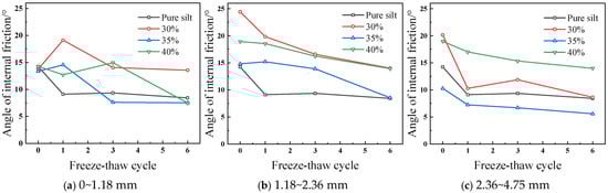 The variation curves of the internal friction angle of marine-dredged mud with improvement by waste steel slag with different waste steel slag dosages are shown in Figure 3. It can be seen that under different freeze–thaw times and waste steel slag particle size conditions when the waste steel slag dosage is 35%, its internal friction angle is lower than in other cases. In the case of 3~6 freeze–thaw cycles of 2.36~4.75 mm particle size and 0~1.18 mm particle size, the internal friction angle of marine-dredged mud with improvement by waste steel slag is lower than that of pure marine-dredged mud. For the case of 0~1.18 mm, due to the small particle size of waste steel slag, the improvement effect of pore size and permeability of marine-dredged mud is poor, resulting in a strong capillary effect and high moisture content of the specimens. According to the research of Cai et al. [], the degree of soil damage caused by freeze–thaw action will increase with the increase in soil moisture content, so the internal friction angle will decrease slightly when the freeze–thaw cycle is 3~6 times. For the case of 2.36~4.75 mm, due to the large particle size of waste steel slag, the structure of the mixed soil may be a dense-suspended type when the content is 35%. Therefore, the waste steel slag aggregates have no contact with each other and cannot form a skeleton, and thus the internal friction resistance is small. When the dosage of waste steel slag with a particle size of 2.36~4.75 mm reaches 40%, the waste steel slag, acting as aggregates, contacts with each other and can form a skeleton. Thus, its structural form may be a framework–pore structure, and the internal friction angle is significantly improved.