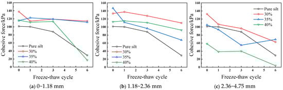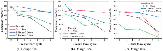 The variation curves of cohesion of marine-dredged mud with improvement by waste steel slag with different particle sizes are shown in Figure 4. In general, when the waste steel slag dosage is small, the waste steel slag with different particle sizes has an improving effect on the cohesion of marine-dredged mud. When the waste steel slag dosage is large, the waste steel slag with a particle size of 2.36~4.75 mm has no improvement effect, instead a reduction effect on the cohesion of marine-dredged mud. When the particle size of waste steel slag is 0~1.18 mm and 1.18~2.36 mm, the cohesion of marine-dredged mud with improvement by waste steel slag is higher than that of pure dredged mud and the other two particle sizes. However, when the waste steel slag dosage is 40% (Figure 4c) and the number of freeze–thaw cycles reaches 5~6 times, the cohesion decreases greatly for the case of 0~1.18 mm particle size, while it shows a smaller decrease for the case of 1.18~2.36 mm particle size, and the cohesion is more stable with the variation of freeze–thaw cycles. This may be due to the fact that the electrostatic attraction, van der Waals force and cementation of the soil are weakened by the influence of freeze–thaw cycles. However, because the geometric stacking effect between the waste steel slag and the dredged mud particles with a particle size of 1.18~2.36 mm is better, the apparent cohesion by the interlocking action between particles is stronger, which makes the reduction smaller when the number of freeze–thaw cycles is more.