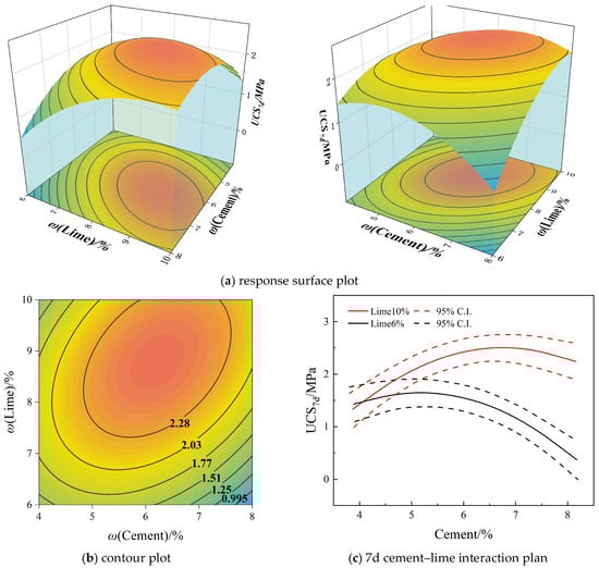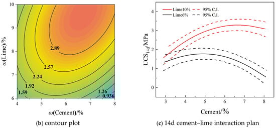 The 3D response surface plots and contour maps of the interaction of different influencing factors (see Figure 6, Figure 7 and Figure 8) are obtained using the Model Graphs module of the Design-expert software. In these figures, (a) and (b) represent the response surface plot and the contour map, and (c) is the interaction plane plot of two components at 7/14d, where the dotted line is the 95% confidence interval.