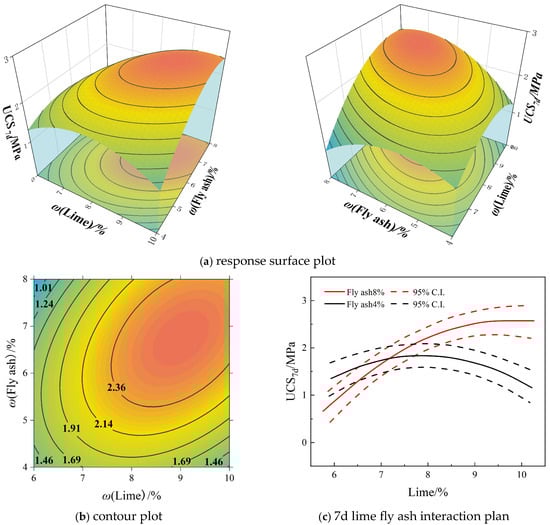 From Figure 7a,b, it can be seen that the 7d unconfined compressive strength of MSWSS first increases and then decreases with the increase in lime and fly ash. The reason is similar to the interaction between lime and cement. It is to increase the alkalinity and calcium dosage of the reaction system to increase the formation rate and amount of C-A-H, etc. []. Among them, fly ash can produce aluminosilicate and calcareous components, and accelerate the formation of C-A-H in the early stage of the reaction. However, with the increase in lime and fly ash dosage, C-A-H is rapidly formed and wrapped in unreacted cement and dredged mud, leading to incomplete contacts, which has an inhibiting effect on the reaction. As a result, the strength will show a downward trend. It can be concluded from Figure 7c that when the dosage of fly ash is 4%, the 7d unconfined compressive strength of MSWSS first increases and then decreases as the lime increases. When the dosage of fly ash is 8%, the 7d unconfined compressive strength of MSWSS first increases and then tends to be stable with the increase in lime. According to Figure 7c, the 95% confidence interval of the 8% variation curve of fly ash shows a downward trend when the lime dosage is 9%~10%. Therefore, it can be speculated that when the lime dosage is high enough, the unconfined compressive strength will show a trend of first increasing and then decreasing.