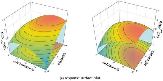 It can be seen from Figure 8a,b that the 14d unconfined compressive strength of MSWSS increases first and then decreases with the increase in cement and lime dosage, which is similar to the trend at 7d. Combined with Figure 6c and Figure 8c, the maximum peak value of the unconfined compressive strength of MSWSS at 14d increases by about 26.8% compared with that at 7d. This is due to the fact that as the age increases, the hydration reaction of the components in the solidified soil is more sufficient, and more C-A-H hydration products are generated, which has a more significant filling effect on the void of MSWSS. At the same time, the highest point of the 14d unconfined compressive strength model with 10% lime dosage appears in the range of 7%~8% cement, which is about 1% higher than the highest point of the 7d unconfined compressive strength model (in the range of 6%~7%). The highest point of the 7d model with 6% lime dosage also has a similar effect to the highest point of the 14d model (from about 5% cement dosage to 5%~6%). It can be inferred that with the increase in curing age, the hydration reaction, carbonation reaction and pozzolanic reaction continue and consume more solidifying agents. Therefore, the dosage of a solidifying agent at the highest point of the unconfined compressive strength model increases.