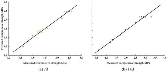 Comparison of measured and predicted 7d and 14d unconfined compressive strength of MSWSS.