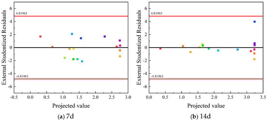 In order to clarify the accuracy and applicability of the optimized response surface model, the experimental response value (measured value) and the model prediction value are compared, as shown in Figure 9. The external studentized residuals are used to detect outliers in regression diagnosis in Figure 10, calculated with the remaining n-1 observations after deleting the ith observation, which should be less than 4.81963 in this test. According to Figure 10, the absolute value of the external studentized residuals. It can be seen from Figure 9 and Figure 10 that the maximum error between the measured and predicted values of 7d and 14d unconfined compressive strength of MSWSS is 3.795% and all external studentized residuals are less than the max value, indicating that the optimized response surface model has high accuracy.