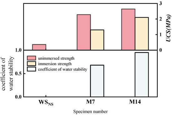 The results of water stability analyses are shown in Figure 11. Among them, the test group number of MWSS without solidification is WSNS, and the test group numbers of MSWSS at the age of 7d and 14d according to the optimal mix ratio of the solidifying agent are M7 and M14, respectively. For WSNS, it is seriously dispersed in the water-soaked state, resulting in its immersion strength of about 0 and poor water stability. The water stability coefficient changes greatly from WSNS to M7. It indicates that the hydration products are formed in MSWSS, such as C-S-H and C-A-H, which can cement the waste steel slag and marine-dredged mud particles, and keep them from collapsing in water. At the same time, the hydration products can fill the pores of MSWSS, and reduce the porosity and permeability of the solidified soil, so that MSWSS has excellent water stability. According to the research of Horpibulsuk et al. [], the addition of lime to the soil can reduce the water sensitivity of the soil. Under the combined effect of these factors, the MSWSS has a significant change in water stability compared to the MWSS.