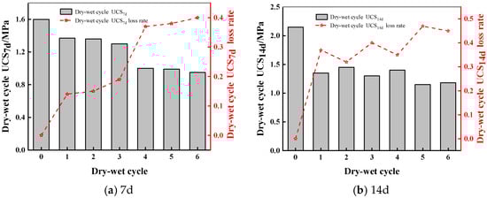 Under the condition of dry–wet cycle 0~6 times, the variation of 7d and 14d unconfined compressive strength of MSWSS is shown in Figure 12. The loss rate of unconfined compressive strength in dry–wet cycle is defined as the rate of unconfined compressive strength compared to the initial strength without cycle. At the age of 7d, the unconfined compressive strength decreases slowly in the first three times of dry–wet cycle, and decreases sharply at the fourth time, and then decreases slowly. The strength loss rate before 4 dry–wet cycles is less than 0.3, while it increases rapidly and reaches 0.37 at 4 dry–wet cycles. Therefore, the turning point at 7d is in the fourth cycle. At the age of 14d, the strength loss rate of the first cycle is more than 0.3, which is significantly reduced. This is because the first dry–wet cycle has the greatest influence on the specimens, and the cyclic action causes cracks in the specimens []. Thereafter, the strength shows a slight increase, which may be due to the fact that as the number of dry–wet cycles increases, the unreacted solidifying agent and the marine-dredged mud in the specimen are fully hydrated, and the cementitious products fill the pores in the specimen, thereby increasing the strength []. In addition, the increase in unconfined compressive strength of the solidified soil and the damage caused by dry–wet cycles is a dynamic equilibrium process []. The reaction between the cementitious material generated by hydration and water continues during the dry–wet cycle process [], especially during the wet stage. At this point, the strength loss caused by the dry–wet cycle is not sufficient to offset the strength growth from the hydration reaction, resulting in an increase in the compactness and strength of the solidified soil [].
