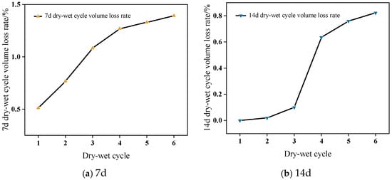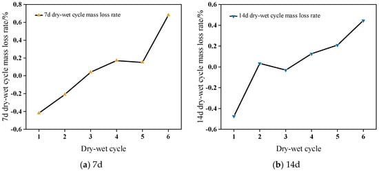 Under the condition of 0~6 dry–wet cycles, the curves of mass loss rate and volume loss rate for MSWSS at 7d and 14d are shown in Figure 13 and Figure 14. Among them, the mass loss rate and volume loss rate are that with a certain number of cycles compared with the initial mass and volume without any cycle. The volume and mass loss rates at 7d and 14d are all below 1.5%. This indicates that the MSWSS has certain dry and wet resistance and good durability. The mass loss rate at 7d and 14d is negative before three dry–wet cycles, because the specimens store a small amount of free water during the dry–wet cycle. From the point of view of the volume variation, the volume loss rate at 7d shows a steady strong upward trend, while at 14d, it changes dramatically below three dry–wet cycles and becomes smooth at larger cycles. This is because the longer the curing time, the more thorough the hydration reaction and the denser the solidified soil. Therefore, the time point of the sharp volume loss is relatively backward, and the volume loss is severe when the dry–wet cycle is 3~4 times.