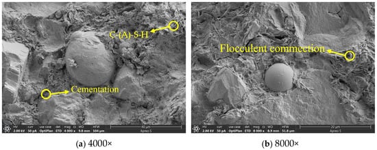 In order to observe the micromorphological changes of MSWSS more carefully, the SEM analyses under 4000 and 8000 times is given in Figure 16. It can be seen clearly that a large number of flocculent, agglomerated and fibrous white gels are formed in the structure of MSWSS. The fibrous zeolite-like amorphous gel product named as hydrated calcium silicate (C-S-H) and plate-like Ca(OH)2 crystals are observed. At this time, the waste steel slag particles, acting as ‘anchoring surfaces’ for cementation, are tightly wrapped by the solidifying gel product, which strengthens the interface transition zone of the two soil particles. Although there are still a small number of pores that have not been fully connected, the overall network gel has been formed. The fibrous C-S-H gel is interspersed in the microscopic pores, constraining the unhydrated waste steel slag and dredged mud particles in the form of a network. Thereby it can enhance the structural integrity and improve the macroscopic properties of the solidified soil.