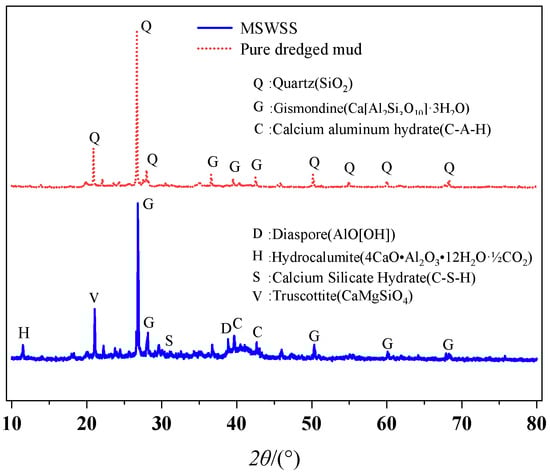 The XRD analyses for pure marine-dredged mud and MSWSS specimens were carried out for main mineral compositions, shown in Figure 17. It can be seen that the marine-dredged mud mainly contains silicate minerals such as quartz (SiO2) and calcium zeolite (CaAl2Si3O10•3H2O). For the MSWSS, a large number of quartz diffraction peaks were found to disappear, indicating that reactions of the cement, lime and fly ash take place and generate hydration products including hydrated calcium silicate and hydrated calcium aluminate.
