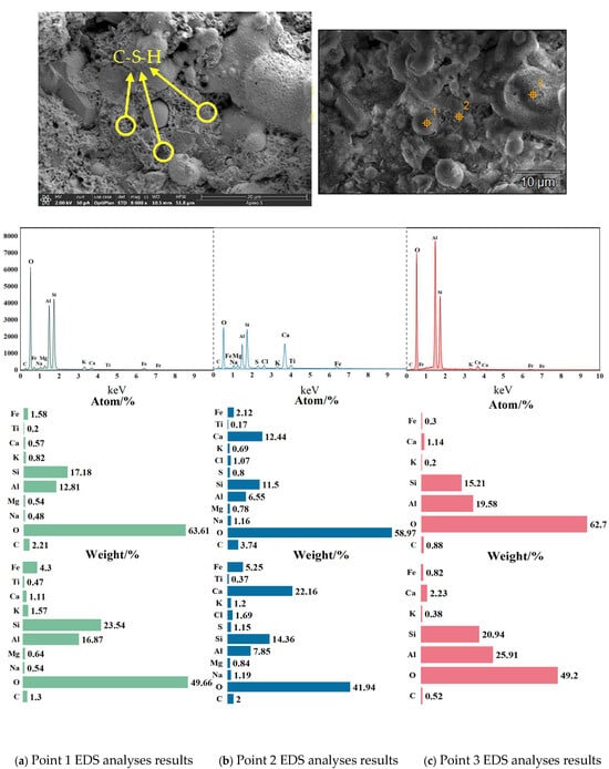 In order to verify the above analyses, SEM-EDS on the MSWSS was analyzed, as shown in Figure 18. According to Figure 18b,c, it is found that MSWSS contains a large amount of Al, Si and O elements at three points 1, 2 and 3 in Figure 18a. Especially at point 2, in addition to the above elements, a large amount of calcium (Ca) was detected. This finding shows that more reticular C-A-H and C-S-H structures are produced in MSWSS. With the filling and cementation effect of these hydration products, soil particles are connected to each other more closely, and a dense network structure is formed inside the soil, resulting in a whole network of gels.