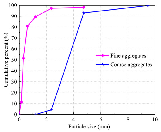 The ingredients used to prepare the rubberized concrete are as follows: ordinary Portland cement (Grade 42.5); polycarboxylate superplasticizer (20% solid content); river sand (particle sizes below 5 mm, apparent density 2582.72 kg/m3, water absorption rate 1.73%, and fineness modulus 2.28); rubber particles produced by grinding waste tires (particle size below 841 μm, and apparent density 988 kg/m3); granite gravel (particle sizes 5-10 mm, apparent density 2547.85 kg/m3, and water absorption rate 0.62%); hook-ended steel fiber (length 32 mm, diameter 0.75 mm, and apparent density 7436 kg/m3, elastic modulus 200 GPa, and tensile strength 2600 MPa); and alkali-resistant glass fiber (length 18 mm, diameter 14 μm, apparent density 2680 kg/m3, elastic modulus 72 GPa, and tensile strength 1700 MPa). The river sands and coarse aggregates used were in continuous grading, as shown in Figure 1.