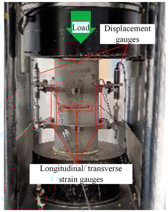 Compression tests of the specimens were carried out on a Matest tester machine with a loading capacity of 4000 kN. The specimens were compressed at a loading rate of 0.18 mm/min as per ASTM C469/C469M [53]. The test data (force, strain, and displacement) were collected at 1 Hz. During the tests, the crack generation time and the crack pattern changes in the specimens were also recorded.