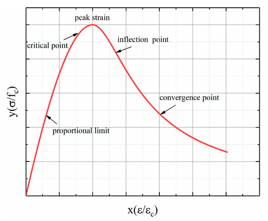 To simulate the stress–strain relationship, a widely used constitutive model proposed by Guo [54] was adopted, which was also incorporated into Chinese standard GB 50010-2002 [55]. The schematic model is displayed in Figure 3 and the model is described in Equation (4), as follows: