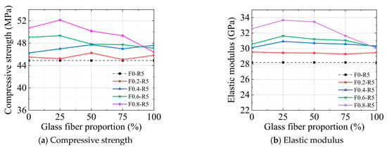 Incorporating rubber particles decreased the elastic modulus of the specimens by 2.8% (Table 2), softening the concrete. However, with steel fiber incorporation, the elastic modulus of the rubberized concrete increased by 4.8%, 6.8%, 8.4%, and 15.5% at dosages of 0.2%, 0.4%, 0.6%, and 0.8%, respectively. Regarding the addition of the glass fibers, the elastic modulus of the rubberized concrete increased by 4.5%, 7.6%, 7.0%, and 6.6% at dosages of 0.2%, 0.4%, 0.6%, and 0.8%, respectively. The improvement in elastic modulus from the glass fibers began to diminish when the fiber dosage exceeded 0.4%. Overall, incorporating steel/glass fibers not only compensated for the losses in elastic modulus due to the rubber particles but also caused the concrete to be stiffer than that without rubber particles.