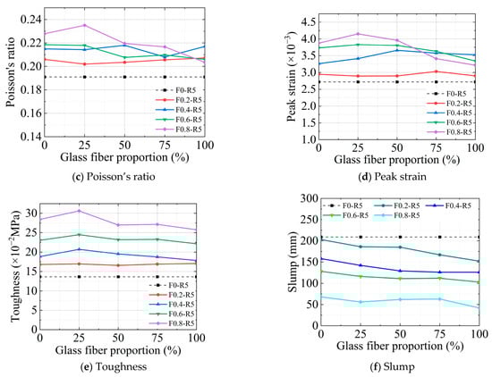 Incorporating glass fibers alone enhanced the compressive strength, elastic modulus, Poisson’s ratio, peak strain, and compressive toughness of the rubberized concrete. However, when the glass fiber content surpassed specific thresholds (0.4% in this study), all the aforementioned parameters except compressive toughness began to decrease. This phenomenon is attributed to the dispersion of glass fibers. At suitable fiber content levels (below 0.6% in this study), glass fibers can be effectively dispersed to manage the development and propagation of microcracks [44] during specimen loading. However, excessive fiber content leads to poorer glass fiber dispersion [59], affecting concrete flowability and potentially causing internal defects.