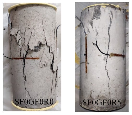 Failure modes after the axial compressive tests are shown in Figure 5. SF0GF0R0 represents the plain concrete and SF0GF0R5 denotes the rubberized concrete. The plain concrete specimens were axially deformed but did not crack when loading reached its peak value. After that, cracks began to occur in the middle of the specimen with an increase in axial deformation. As the cracks developed and gradually extended to both ends, the specimen was quickly broken. After failure, the crack widths and numbers were relatively large, and the specimens showed obvious brittleness. The rubberized specimens behaved similarly to the plain concrete before cracking. However, the crack generation occurred before that of the plain concrete, as the rubber particles reduced the concrete strength and cracking occurred earlier. There were fewer cracks after failure in the rubberized concrete, probably because the highly elastic rubber particles enhanced the concrete toughness (by 11.7%, as shown in Table 2), allowing for greater deformation before compression failure. In other words, a single crack could deform more and absorb more energy; therefore, fewer cracks were generated to dissipate the input energy.