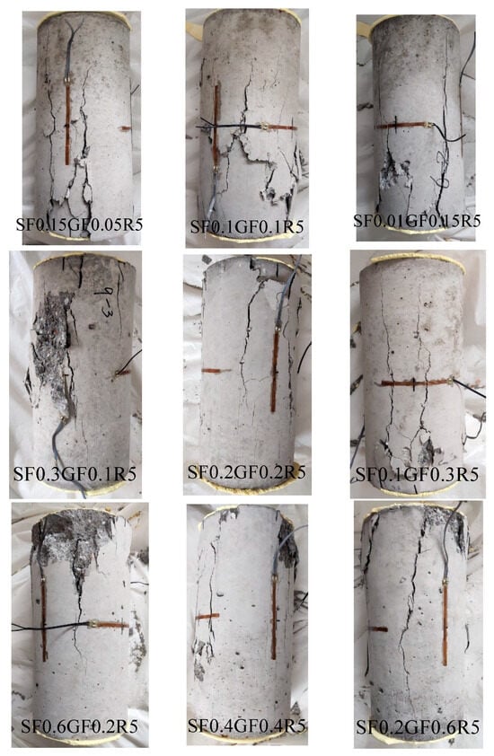 In the rubberized concrete with hybrid fibers, specimens exhibited delayed cracking with increasing glass fiber proportions. Cracks initiated at the middle of the specimens; then, small diagonal cracks appeared at both ends and gradually extended to the middle until failure occurred. The failed specimens are shown in Figure 6. In general, the failure mode of the rubberized concrete with fibers shifted from shear failure to tensile failure [14].