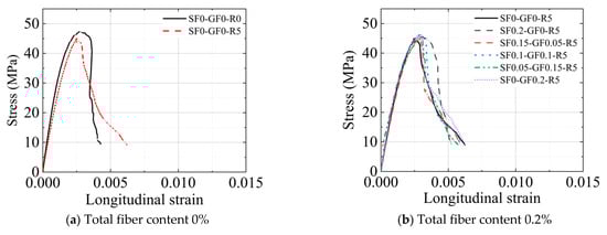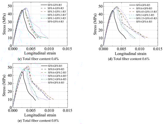 The stress–strain curves of the specimens are presented in Figure 7. In general, each curve comprises three segments, as follows: a linear ascending section; a nonlinear ascending segment; and a descending segment after reaching the peak. The linear ascending section primarily extends from the beginning of the load to a proportional limit (at about 40% of the peak stress). The nonlinear ascending section primarily extends from the proportional limit point to the peak stress point. The descending section occurs between the peak stress point and the complete failure point of the specimen. With the addition of rubber particles, the stress–strain curve ascended/descended more gently than that of the plain concrete, suggesting that the rubber particles improved ductility. However, the incorporation of rubber particles also reduced the peak stress (compressive strength) (Figure 7a). As can be seen in Figure 7b to 8e, the stress–strain curves of the specimens with the glass fibers were mostly below those of the specimens with the steel fibers, indicating that the steel fibers improved the compressive performance more than the glass fibers. With the hybrid fibers incorporated, the descending sections of a few stress–strain curves lie above those of the specimens with a single type of fiber, showing that certain hybrid fibers outperform the single fibers. At a total fiber content of 0.2%, the peak stresses of the specimens were similar to those of the specimens with a single type of fiber, indicating minimal synergistic effects. When the total fiber content was 0.6% or 0.8%, the peak stresses of the specimens with hybrid fibers showed obvious improvements compared to those of the specimens with a single type of fiber.