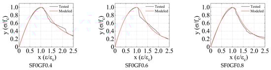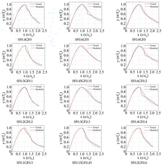 Due to the brittleness of plain rubberized concrete and the limited improvements observed with a fiber content of 0.2%, data from the specimens with a fiber content above 0.2% were used to construct the constitutive model. The specimens were divided into five groups: GF-0%, GF-25%, GF-50%, GF-75%, and GF-100%, based on the glass fiber proportions in the hybrid fibers. The values of A and B, which are the parameters for the model developed by Guo [54], are shown in Table 3.
