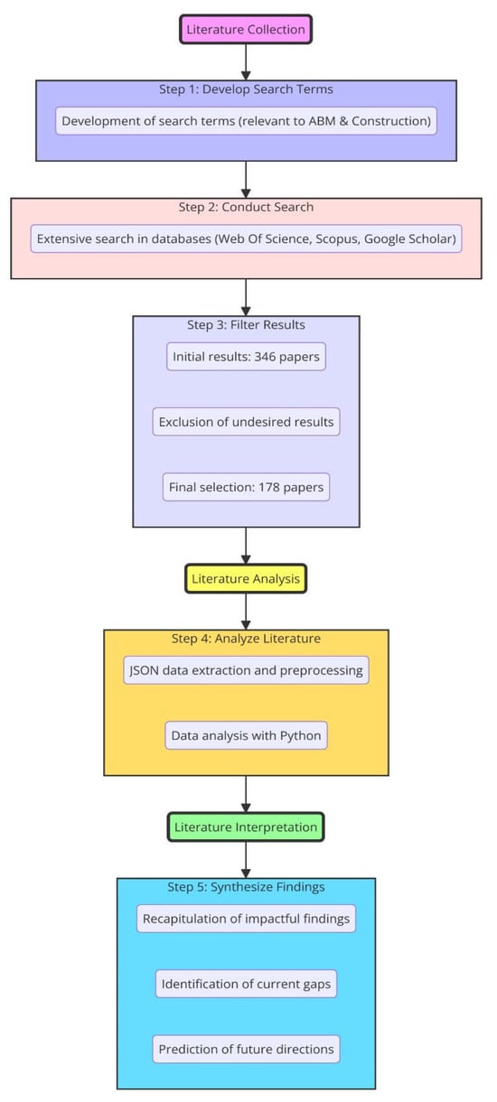 The final and fifth step was dedicated to synthesizing the findings from the literature analysis. This involved summarizing the key outcomes, identifying existing research gaps, and considering the implications for future research directions. This synthesis aimed to build a cohesive understanding of the state of ABM research in construction and to guide subsequent scholarly inquiry in this burgeoning area.