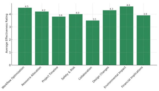 Figure 4 represents the results of a survey conducted with experts from the AEC industry regarding the effectiveness of ABM in various aspects of the industry. Each bar reflects the average rating given by these experts on a scale from 1 to 5, with 5 denoting “very effective” and 1 denoting “not effective”. The results indicate strong confidence in ABM’s effectiveness across several key areas. Workflow Optimization, Resource Allocation, and Environmental Impact received particularly high ratings, suggesting that experts believe that ABM can significantly improve these areas. The slightly lower but still positive ratings for Project Timeline, Safety and Risk Management, and Collaboration highlight areas where ABM is seen as beneficial, though perhaps with room for further development or application. Design Changes and Financial Implications also scored well, indicating a broad consensus on ABM’s potential to positively influence a wide range of outcomes in the AEC industry.
