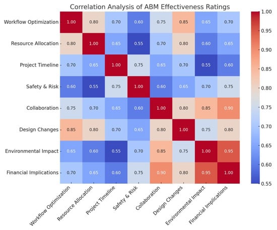 Moreover, each cell in Figure 5 represents the correlation coefficient between two aspects, ranging from −1 (perfect negative correlation) to +1 (perfect positive correlation), with 0 indicating no correlation. High positive values suggest that experts who rate one aspect of ABM as effective tend to also rate other aspects as effective, indicating interconnected benefits of ABM applications. For instance, in the heatmap provided, the correlation between “Workflow Optimization” and “Design Changes” is notably high at 0.85, suggesting a strong positive relationship. This implies that experts who perceive ABM as highly effective in optimizing workflow processes also tend to recognize its significant impact on facilitating design changes. This could be due to ABM’s ability to simulate various scenarios, enabling better decision-making which not only streamlines workflow but also supports the adaptability and efficiency of design modifications in response to project needs or constraints. Similarly, the correlation of 0.95 between “Environmental Impact” and “Financial Implications” indicates that improvements in environmental sustainability through ABM application are closely associated with positive financial outcomes, perhaps through cost savings or enhanced project value. These can inform stakeholders in the AEC industry about the multifaceted benefits of ABM, encouraging its integrated application across project planning, execution, and evaluation phases. To further enhance the modeling of diverse agent behaviors in ABM applications, it is essential to address variability within agent populations. Also incorporating recent study methods [95] allows for a more nuanced representation of agent diversity, improving the accuracy of simulations. DSPS facilitates the systematic reproduction of different sub-populations by focusing on key characteristics and behaviors, enabling the model to reflect real-world variations more effectively. By employing this method, ABM can better capture the complexities inherent in the AEC industry, leading to more reliable predictions and insights that account for the variability in agent interactions and outcomes.