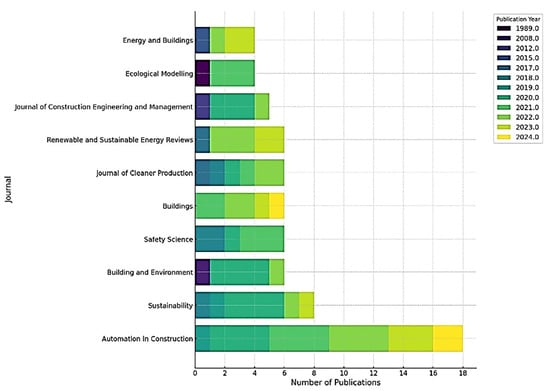 Figure 7 illustrates a steady growth in publications within the top 10 academic journals from 1989 to 2024, showcasing sustained scholarly dedication and inquiry in our domain. This steady rise not only reflects a consistent academic commitment but also reveals the varied landscape of academic publishing. Some journals have been mainstays throughout this period, while others have seen their publication volumes vary, indicating shifts in research priorities or editorial directions. Notably, the Automation in Construction journal stands out for its significant contribution, consistently ranking at the forefront in terms of publication volume. Behind it, Sustainability and Building and Environment are also recognized for their impact.