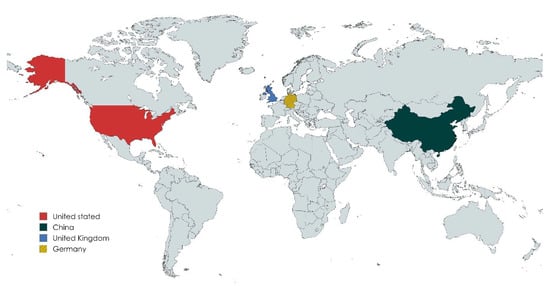 The distribution of the articles by country is illustrated in Figure 9, where the top countries are identified. The United States has the highest rank (32.8%), followed by China (27.1%), the UK (22.1%), and Germany (18%) regarding the number of publications in this area.