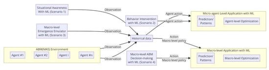 From 2010 to 2024, ABM’s prevalence in social science [30], epidemiology [31], economics [32], and industrial business research [33] became more pronounced, with applications in many fields [34,35,36,37]. The integration of machine learning algorithms with ABM led to more sophisticated agent behaviors and enhanced model calibration, signaling a new era of intelligent system simulations [38,39,40,41].