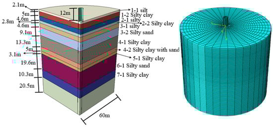 During the simulation, a soil model is created based on soil layer conditions. Figure 1 illustrates the foundation size and grid division results. Due to varying layer thicknesses, the mesh sizes differ. We verified that mesh size minimally affects the final result’s accuracy. Soil and pipe pile units are modeled as three-dimensional solid units (C8D8R). Assuming equal friction coefficients inside and outside the pile wall, it is expressed as tan(0.75φ) [,], where φ is the soil’s internal friction angle. A weighted average algorithm calculated the friction coefficient of different soil layers, resulting in an average friction coefficient μ = 0.28.