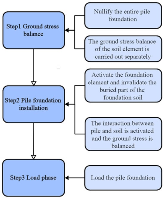 Figure 2 is the flow chart of the simulation calculation steps. The calculation steps of finite element analysis are divided into the ground stress balance stage, steel pipe pile installation stage, and loading stage. In it, gravity with an acceleration of 9.8 m/s2 acts on all three steps: