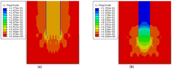 Contour maps of vertical displacement near pile tip: (a) settlement of soil near pile end in CASE 2 (b) settlement of soil near pile end in CASE 3.