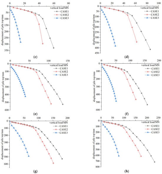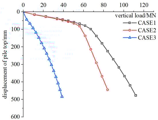 Based on the results obtained under different conditions, Q-s curves for the steel pipe piles were derived and are shown in Figure 5. Typical bending Q-s curves were observed in CASE 1 and CASE 2, while a progressive curve was noted in CASE 3. For the progressive curve, the vertical bearing capacity reaches its ultimate stage when the settlement reaches 0.05D (where D represents the pile diameter). Therefore, in CASE 3, the pile reaches its ultimate bearing capacity when the settlement reaches 300 mm.