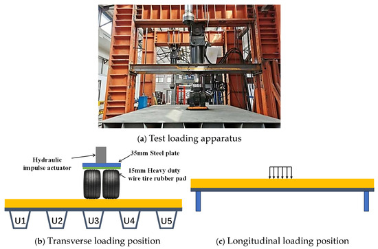According to the fatigue load model outlined in the Code for Design of Steel Highway Bridges (JTG D64-2015) [24], the loading area was 600 mm × 200 mm. To simulate the effect of wheel action, a 35 mm steel plate with 13 mm of tire rubber was placed under the loading apparatus. The most unfavorable position under the most adverse loading conditions was selected as the loading position. The center of transverse loading was aligned with the U-rib weld. The longitudinal loading position was situated at mid-span. The loading position is provided in Figure 1b,c.