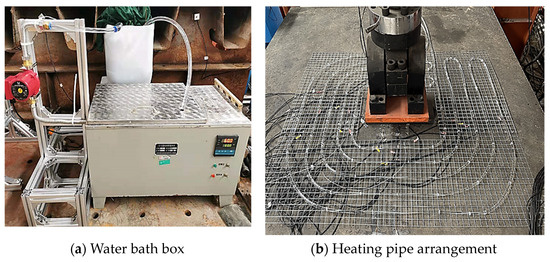 The test commenced loading at a pavement temperature of 15 °C. After approximately 24,074 load cycles, the pavement layer was heated using a circulating water bath. During the test, the pavement surface reached a maximum temperature of 50 °C after approximately 528,800 load cycles. Subsequently, the temperature of the pavement surface remained constant at 50 °C until the conclusion of the test. The water bath heating device is shown in Figure 2.