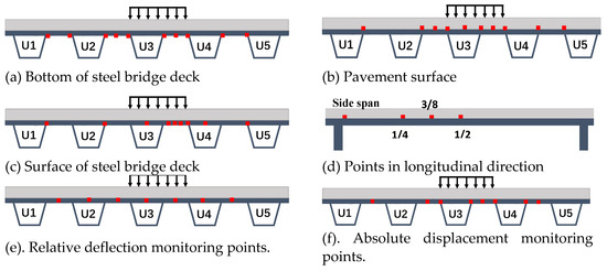 Figure 3 illustrates the configuration of the monitoring points. As illustrated in Figure 3a–c, the transverse bridge strain monitoring points are positioned at the mid-span in the following locations: the butt weld between the U-rib and the steel bridge deck, between two adjacent U-ribs, and inside the U-rib. As shown in Figure 3d, the longitudinal bridge strain monitoring points are arranged at the diaphragm, 1/4 span, 3/8 span, and 1/2 span. The relative deflection monitoring points in the transverse direction are arranged between two adjacent U-ribs and inside a U-rib, as shown in Figure 3e. The absolute displacement monitoring points in the transverse direction are arranged at the following positions in the middle of the span: the butt weld between the U-rib and the steel bridge deck and between two adjacent U-ribs, as shown in Figure 3f.