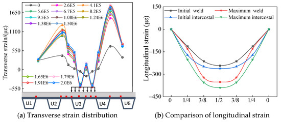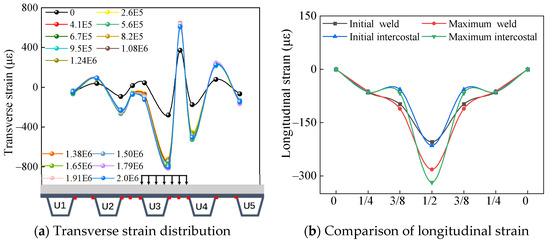 In summary, the maximum transverse strain at the bottom of the steel bridge deck is compressive strain, with a value of 816 με, which is 2.6 times greater than the maximum longitudinal strain. This also validates previous research that transverse strain is a key parameter for evaluating the stress at the bottom of the steel bridge deck [26,27].