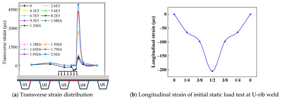 Figure 9a shows that the maximum transverse tensile strain on the surface of the steel bridge deck reaches approximately 706 με under 260,000 cycles of dynamic loading, which is about 0.9 times the maximum tensile strain observed under static loading. Figure 9b indicates that the maximum tensile strain produced by the dynamic load is approximately 4434 με, which is about 0.91 times the maximum tensile strain under static load. In summary, when subjected to the same load, the transverse strain on the surface of the steel bridge deck generated by the dynamic load is approximately 0.9 times that produced by the static load.